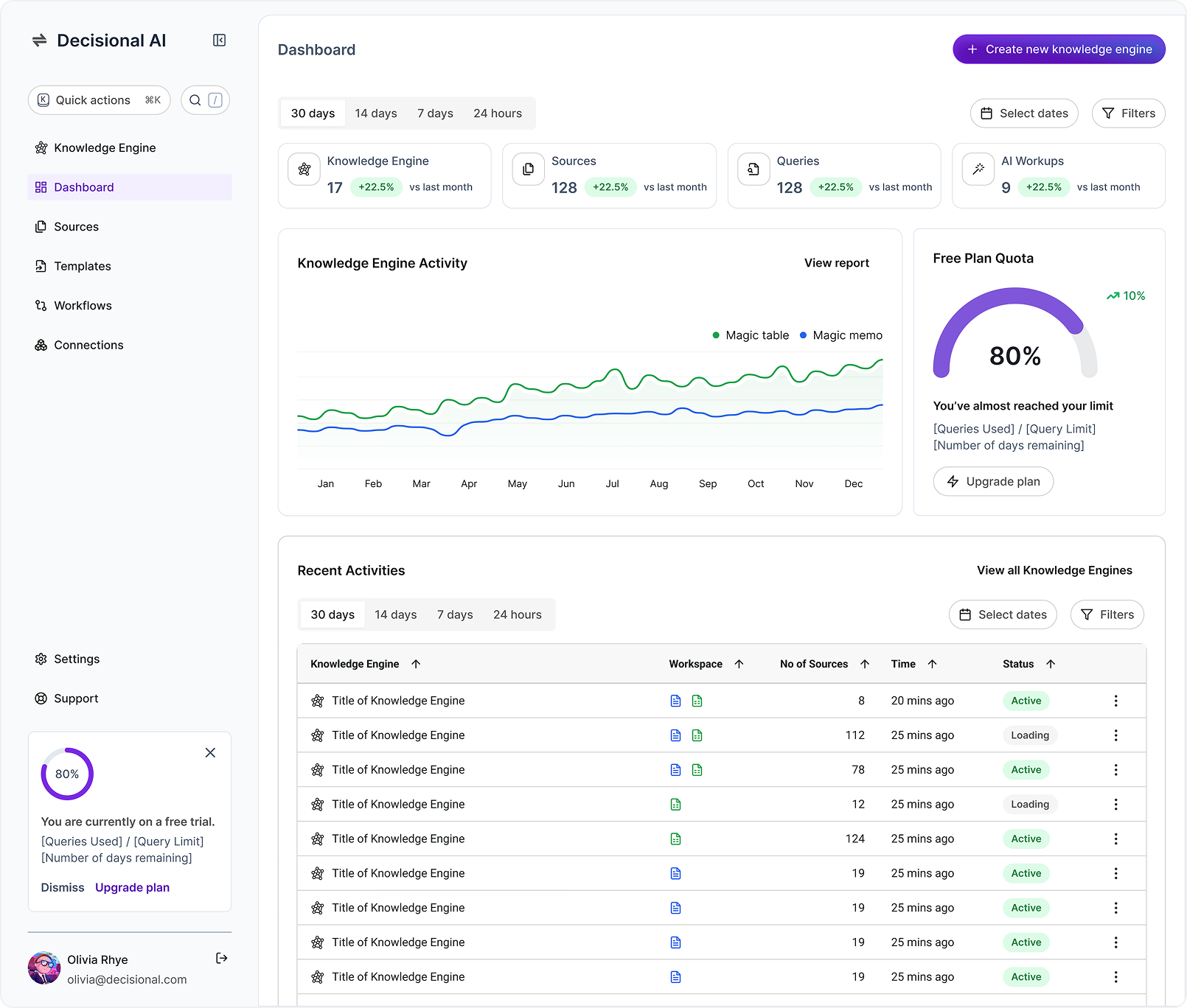 A full redesign deployed across sign-up, dashboard, and core Knowledge Engine. Unified design system and flexible layout for source panel and Decisional AI assistant.