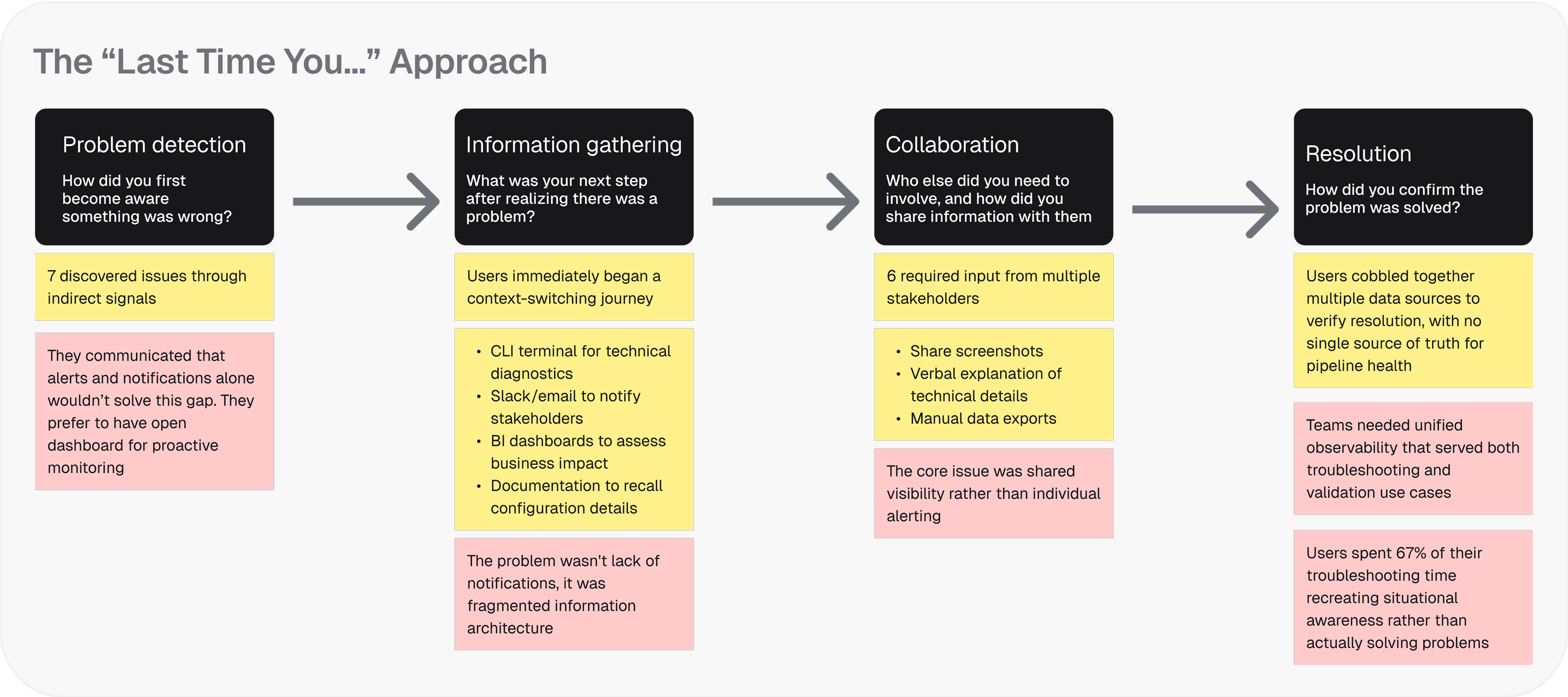 To validate whether comprehensive observability would truly address user needs better than trigger boards, I had a follow-up research flow that traced the complete problem-solving journey users experienced when pipeline issues occurred.